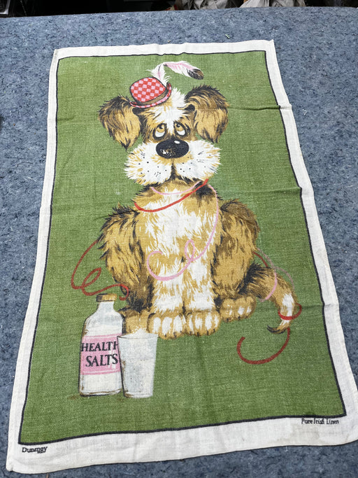 Pure Irish Linen Tea Towel with adorable dog in hat & health salts